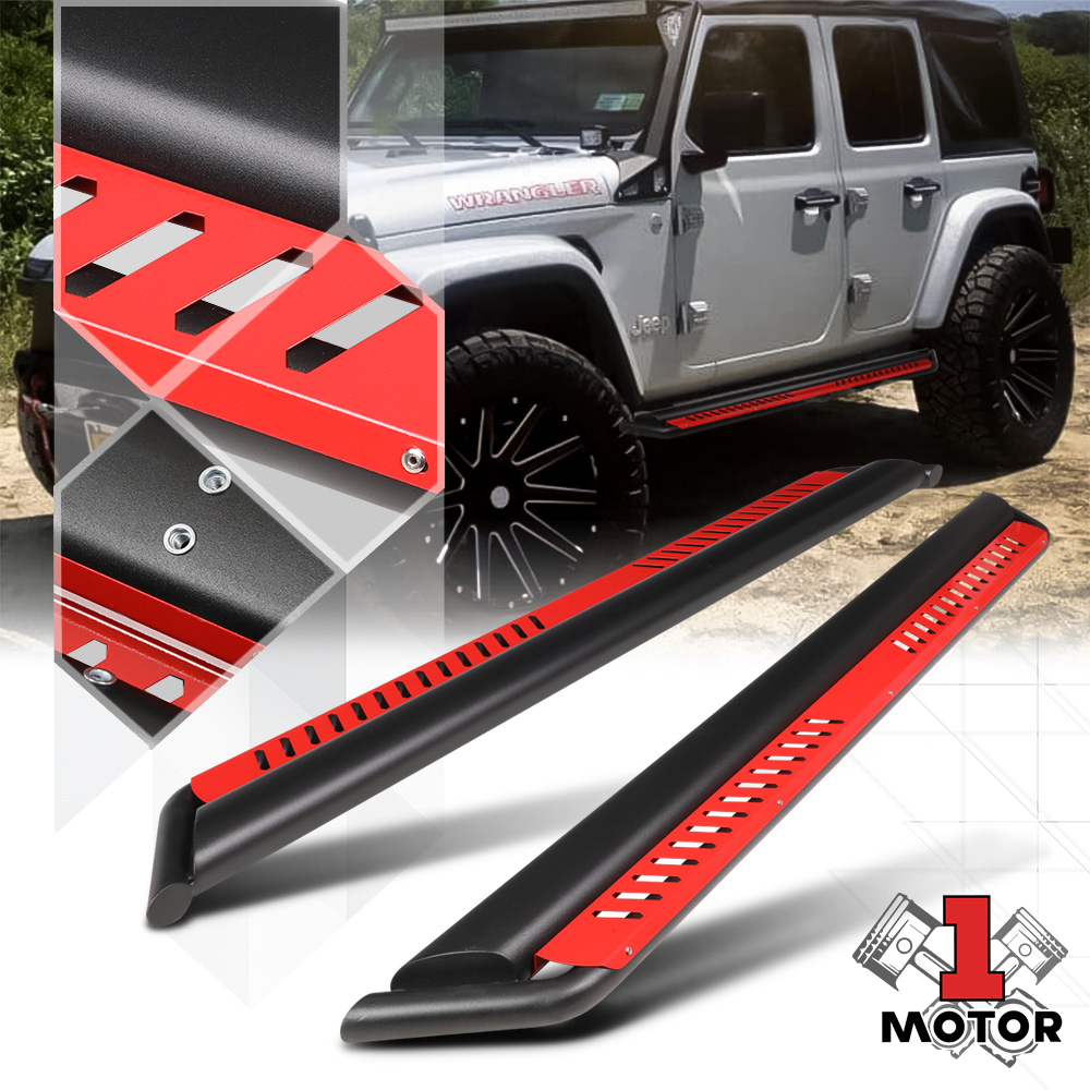 The red jeep is outfitted with 2 seats, front and back fenders and a jeep grille.